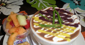 side order of black beans and rice and loved both choices. The crisp romaine and croutons came topped with shaved parmesan; the beans and rice artfully topped with a lime cream and raspberry coulis, was accompanied by a mango fruit salsa. My fork found its way for samples of both dishes. A chat with our waitress brought the recommendation of the grilled shrimp caesar for a future lunch.