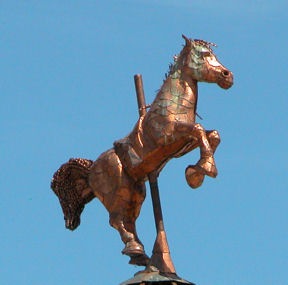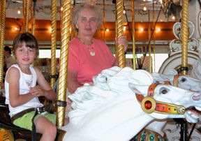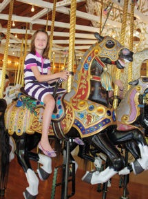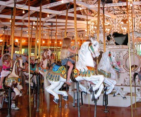 stretching out with each rotation in hopes of grabbing the golden ring. Those who succeed receive a free ride. Awaiting our turn we careful scrutinize the passing array of horses. Do we want to mount a red sorrel, dapple gray or strawberry pinto? Each horse is individually painted and adorned in colorful “trappings”, tails are made from real horse hair and color coordinated.