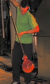 When entering the working studio we note the heat and roar of gas furnaces where batch glass is melted to temperatures over 2,000 degrees Fahrenheit. A team member gathers molten glass on the end of a blowpipe. With the first breath of air we see the magical beginnings of an art form dating from the time of Christ. As the objects are shaped and blown they require reheating in the glory hole to keep the piece malleable. Other team members prepare colors and additional molten materials. The artist keeps the pipe in perpetual Artist in Hot Shopturns using and resisting the powers of gravity and centrifugal force.