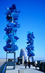 Each of the glacial blue Crystal Towers standing 40 feet above the bridge deck are made of 63 large hollow Polyvitro crystals, not glass. Chihuly comments, “As with glass, it is really light that makes the Polyvitro crystals come alive."