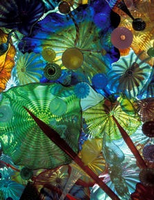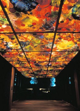Ceiling Panel DayA - Blog Light streams through thousands of handcrafted glass objects resembling purple sea urchins, red reeds, and ruffled clamshells. We stand beneath a 50-foot ceiling along a portion of the pedestrian Chihuly Bridge of Glass which spans Interstate 705 in Tacoma, Washington. The longer we observe the art forms inspired by the sea the more details surface to our appreciative eyes.