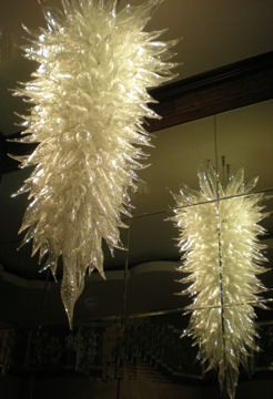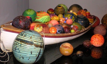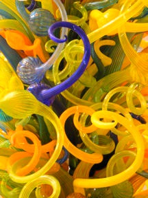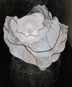 Chihuly is an artist always moving into new arenas, challenging the limits and gaining inspiration from a broad spectrum. The museum showcases works throughout his career and from many of his series – Ikebana, Chihuly - Macchia Forest and Reflections-n Putti, baskets, spears and Jerusalem Cylinders. The Macchia Forest pieces deserve close attention. Macchia is Italian for spotted. Not only are these giant freeform bowls spotted with intense color, the exterior and interior colors are different. A layer of white opaque glass separates the two sides. As light shines through the pieces the wall shadows fascinate as much as the glass. When I think of the beginning glob of molten glass and see the final size and complexity of construction I can’t help but wonder, “How do they do that?”