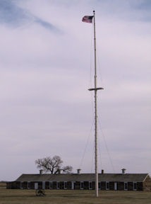 March 2010 – A 37-starred flag unfurls in the stiff Kansas wind over a quiet Fort Larned National Historic Site. From 1859–187FLNHS - Flag8 the Fort was an  important link along the Santa Fe Trail. Today nine of the original stone and timber buildings and the reconstructed Blockhouse echo with the history of the march to the American West. First established to protect traffic along the Santa Fe Trail, Fort Larned later served as an agency for the Indian Bureau and, after the Civil War, soldiers from he Fort protected Santa Fe Railroad construction.