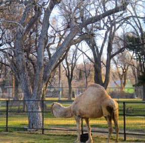 Garden City Zoo - Camel Because we wanted to get back to Denver before an impending snowstorm hit we didn’t have time to do the zoo justice. As we made our morning visit the only other people around were employees and construction crews working on new facilities. It would have been great to leisurely stroll the pathways. Instead, from the car we noted the majestic African Lion watching as we passed by. Jaguar, bison, red kangaroos, antelopes from Asia, Africa and North America, one and two hump camels (Dromedaries from North Africa, Bactrian from the Gobi Desert)  – even on a short visit we could see the wide range of the animal world represented.Garden City Zoo - Two-Hump Camel