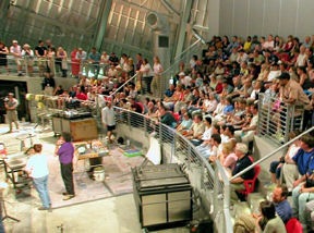 The cone houses the core of the museum’s commitment to glass – The Hot Shop Amphitheater. Tiered seating accommodates 200 visitors while teams of artists experiment, demonstrate and create with molten glass in this arena for art. Cameras transmit live video to large screens providing up-close viewing of the process while a narrator explains terminology, materials and techniques, and answers questions from the entranced audiencHot Shop Audiencee. Not in Tacoma? Watch the Hot Shop in operation live via web streaming.