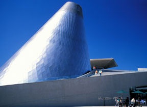 Clad in stainless steel, a distinctive 90-foot tilted cone symbolizes the city’s transformation from industrial to cultural center. Architects took inspiration from the wood burners found at sawmills when the regional economy prospered from lumbering. A grand staircase wraps down the cone to the museum entrance.