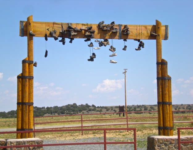 After completing 10-day treks Scouts frequently throw their worn hiking boots over a Philmont entrance gate.