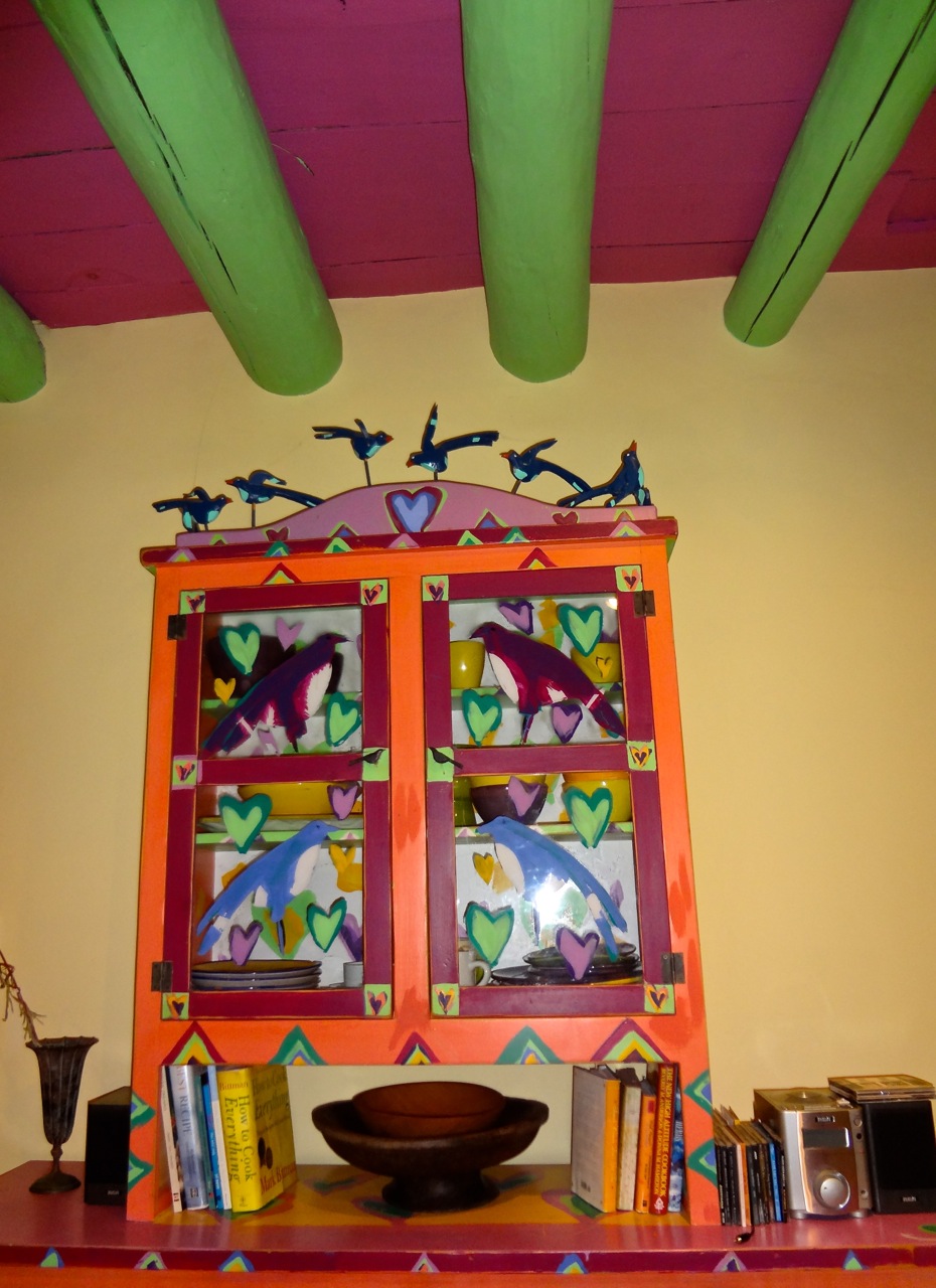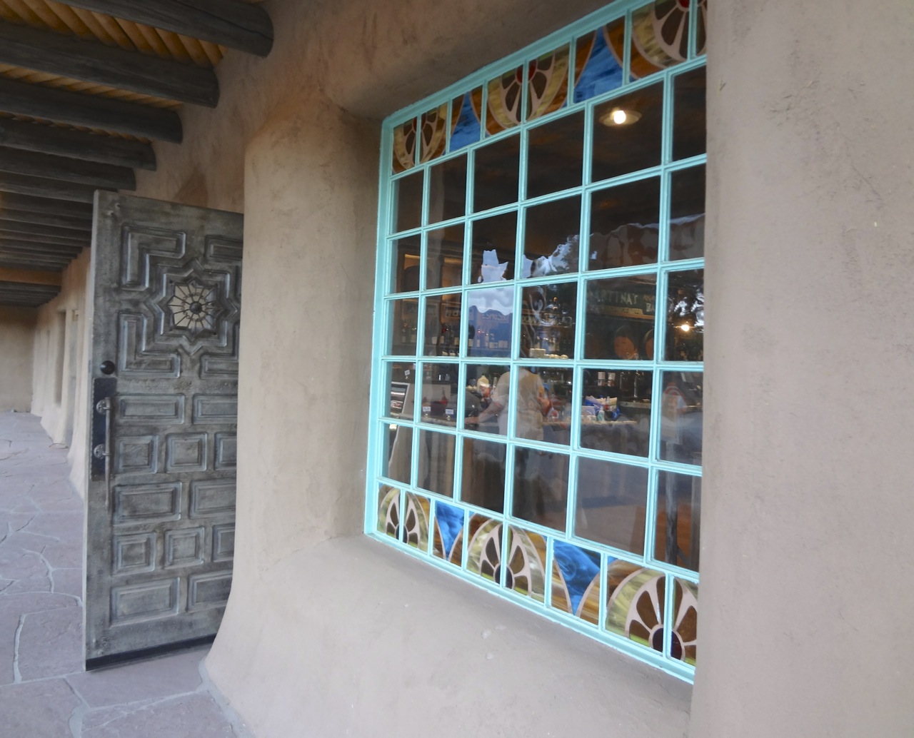 The spacious dining room reflects traditional New Mexico design, such as a corner kiva fireplace ,combined with simple contemporary detail. Banco seating along one long wall was surprisingly comfortable with the multitude of turquoise-colored pillows adding a dash of color to the surrounding earth tones.