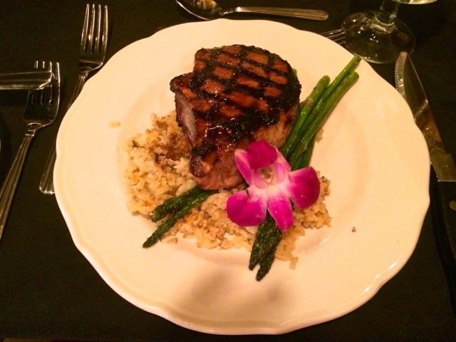 Our waiter, from Argentina, greeted us with a basket of warm bread, butter and goblets of ice water. After indulging in the rich lobster bisque I tackled a thick grilled Sioux City Sarsaparilla Bourbon glazed pork chop served on dirty rice along side fresh asparagus spears. Bob selected the popular Braised Buffalo Osso Bucco accompanied with horseradish cream, green beans, crushed potatoes and caramelized onions. An edible orchid adorned each entree.