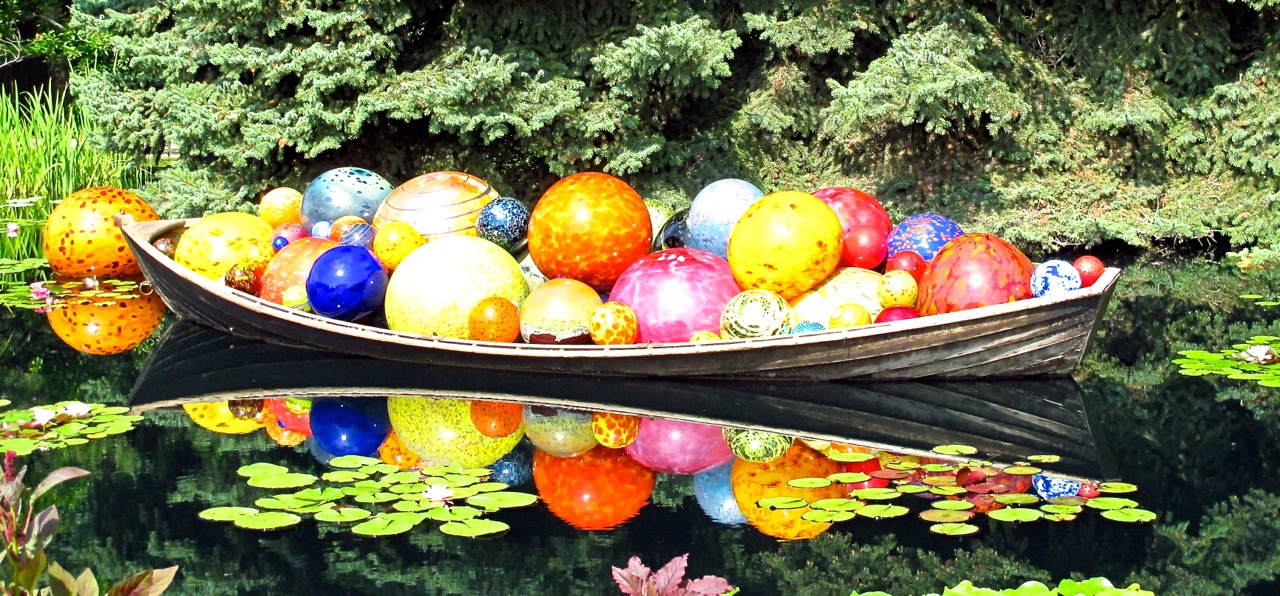 AZ - Ball BoatAlthough Denver has a semi-arid climate, there are more water features in the gardens giving additional visual opportunities. Boats dry docked in the desert rest in lily pad studded ponds with striking reflections.