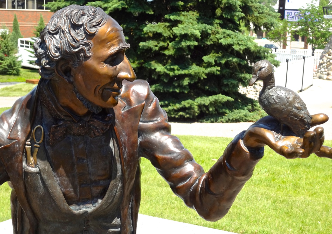 Other structures in the park include a Danish windmill, a grass-roofed stabbur (storehouse), a colorful, 30-foot tall Swedish Dala horse, and a 230-year-old log house from Sigdal, Norway. Sculptures represent a famed ski jumper, a Norwegian skier, Leif Eirikssen and Danish author Hans Christian Andersen. A walkway winds through the neatly landscaped grounds, and pass a pond, waterfall, Plaza Scandinavia (granite map) and Eternal Flame.