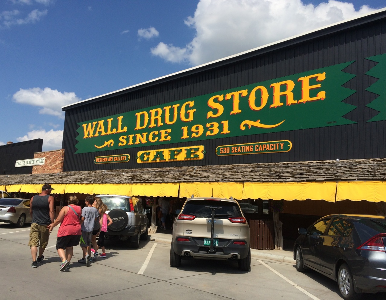 If your idea of vacation fun is jostling elbows with humanity intent on exploring every shelve of tacky tourist souvenirs don’t miss Wall Drug Store in Wall, South Dakota. Indeed if you’re traveling within a hundred miles of Wall it would be hard to miss. At every opportunity a Wall Drug Store billboard has been constructed. Imagine – Free Ice Water, Cafe That Seats 530, Donuts, Ice Cream, 5 Cent Coffee – on and on. Wow, can you stand the anticipation?