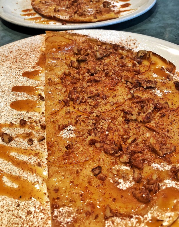 Our custom pannenkoek dessert featuring apples, maple pecans and caramel. Yum!