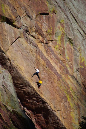 Prepared for a full day of jury selection and possible service the day seemed a gift after my name wasn’t called for the selection process. January temperatures in the 50s and cloudless blue skies promised a perfect day to go adventuring. We decided to make our first visit to Eldorado Canyon State Park south of Boulder followed by an informative hour at the Bradford Washburn American Mountaineering Museum in Golden.Rock Climber
